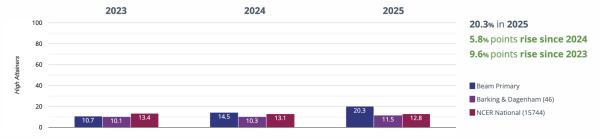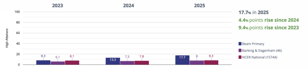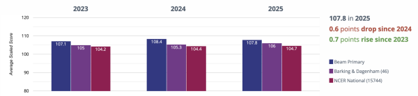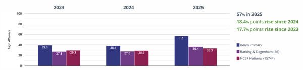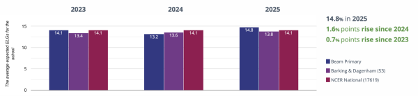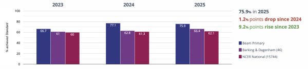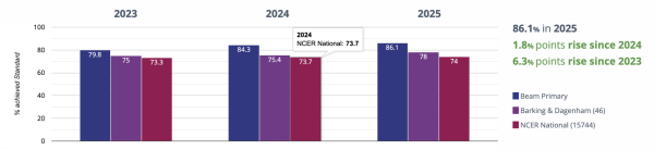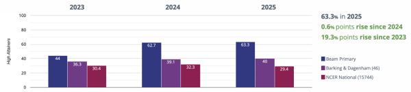 In 2025: 71.2% of Beam children achieved a Good Level of Development, compared with 68.3% nationally.